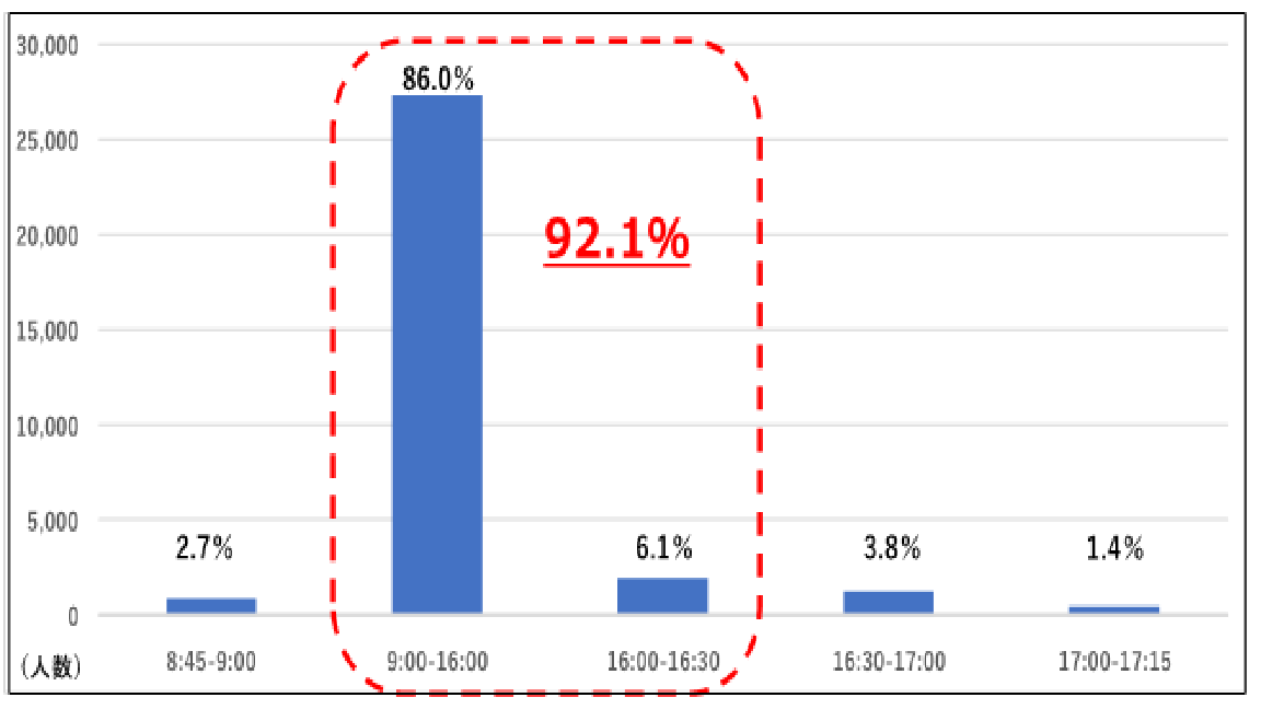 窓口受付時間の対象となる9時~16時30分の間の来庁者は、92.1%となっており、それ以外の時間帯の来庁者は、7.9%(1割未満)となっています。今後もより一層手続きの電子化を推進し、市役所に来ていただかなくてもできる手続きを増やしていきます。