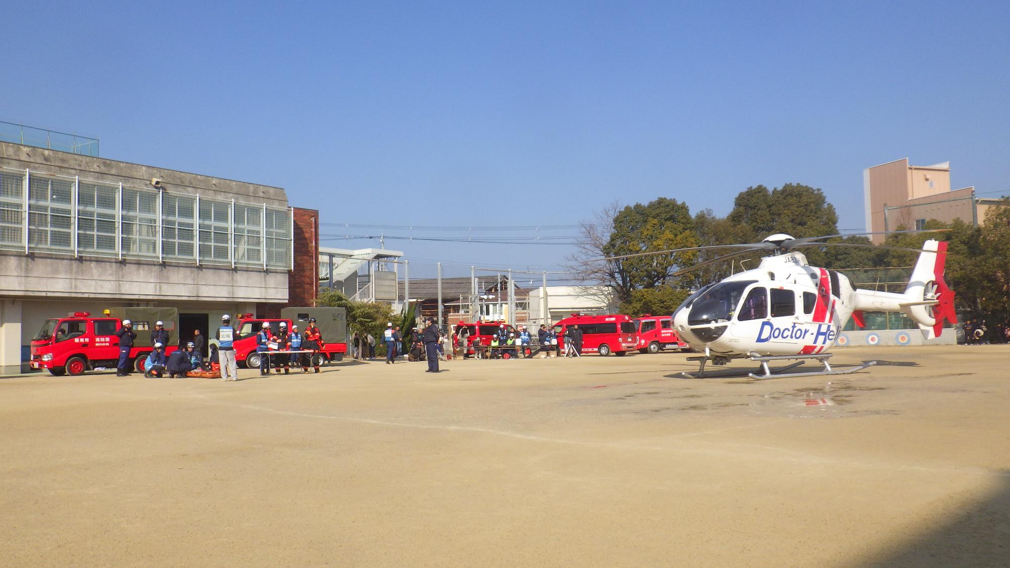 消防による救助訓練が実施され、ドクターヘリが着陸します。訓練終了後にドクターヘリと写真撮影をすることができるかも…