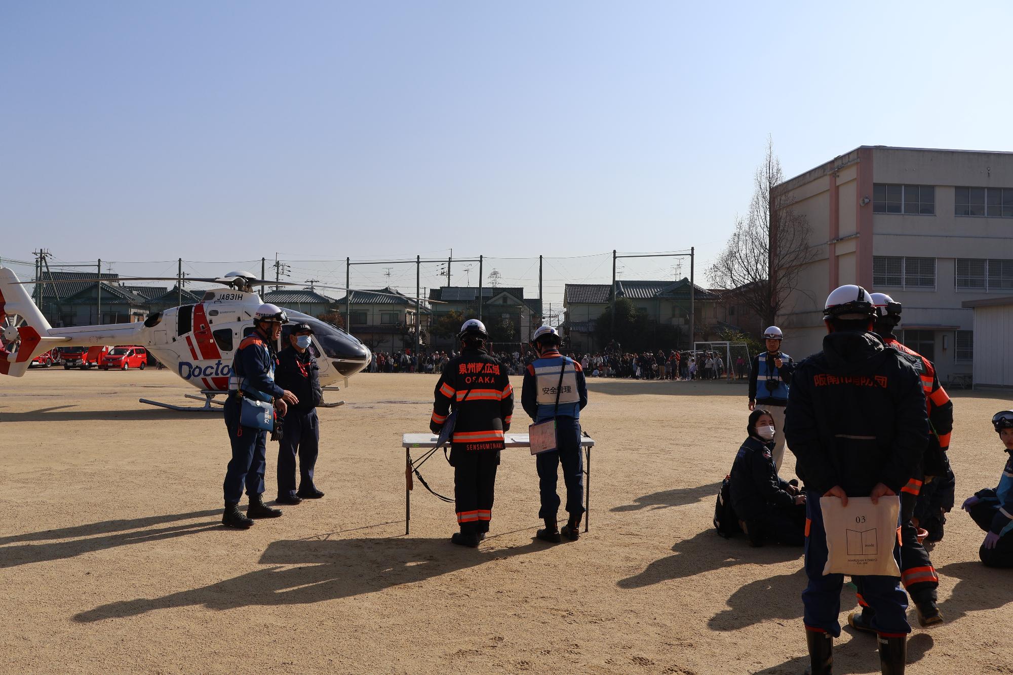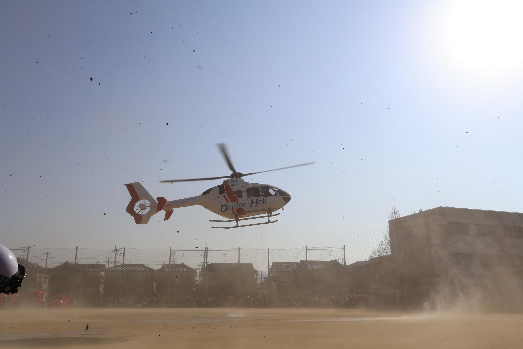 ※周辺住民の方と小学校内にいる方は着陸時の砂埃と騒音にご注意ください。