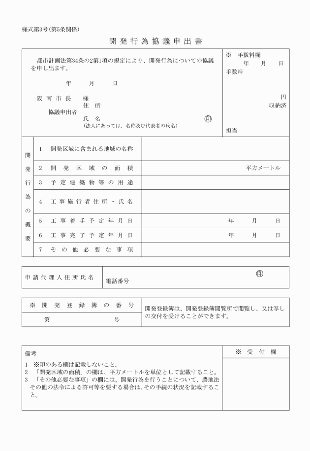 第5条 国の機関又は都道府県等(法第34条の2第1項に規定する都道府県等をいう。以下同じ。)は、同項の協議をしようとするときは、開発行為協議申出書(様式第3号)を市長に提出しなければならない。